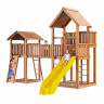 Игровая площадка изготовлена из клееного соснового бруса и массива сосны .Дерево обработано безопасной декоративно-защитной пропиткой. Технология значительно увеличивает срок службы конструкций, повышает прочность древесины, защищает её от гниения и грибков .Игровая площадка имеет оптимальный набор элементов :